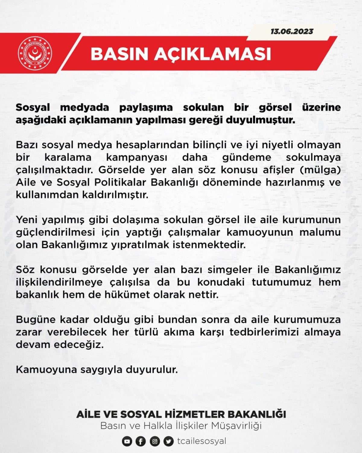 “Bazı sosyal medya hesaplarından şuurlu ve iyi niyetli olmayan bir karalama kampanyası daha gündeme sokulmaya çalışılmaktadır. Görselde yer alan söz konusu afişler Aile ve Sosyal Politikalar Bakanlığı döneminde hazırlanmış ve kullanımdan kaldırılmıştır. Yeni yapılmış gibi dolaşıma sokulan görsel ile aile kurumunun güçlendirilmesi için yaptığı çalışmalar kamuoyunun malumu olan Bakanlığımız yıpratılmak istenmektedir. Söz konusu görselde yer alan bazı simgeler ile Bakanlığımız ilişkilendirilmeye çalışılsa da bu konudaki tavrımız hem bakanlık hem de hükümet olarak nettir. Bugüne kadar olduğu gibi bundan sonra da aile kurumumuza zarar verebilecek her türlü akıma karşı tedbirlerimizi almaya devam edeceğiz.”