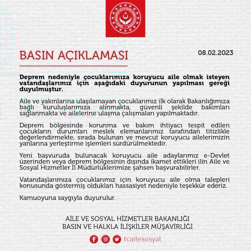 Konuya ilişkin Aile ve Sosyal Politikalar Bakanlığı'ndan yapılan açıklamada şu ifadelere yer verildi: