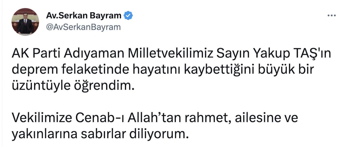 Depreme Adıyaman'da yakalanan AK Parti Adıyaman Milletvekili Yakup Taş ve ailesi, yıkılan binanın enkazı altında kaldı.