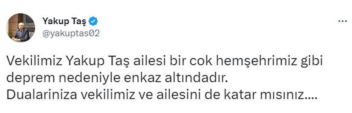 Vekilimiz Yakup Taş ailesi birçok hemşehrimiz gibi deprem nedeniyle enkaz altındadır.
