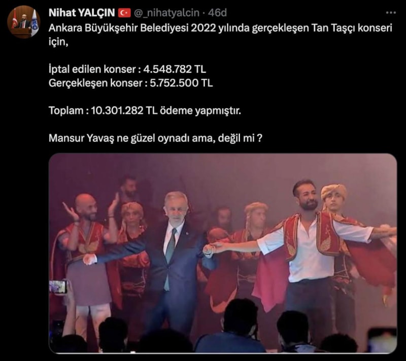 Ankara Büyükşehir Belediyesi AK Parti Meclis Üyesi Nihat Yalçın, Mansur Yavaş'ın, Tan Taşçı konseri için toplamda 10 milyon 301 bin lira ödeme yaptığını iddia etti.