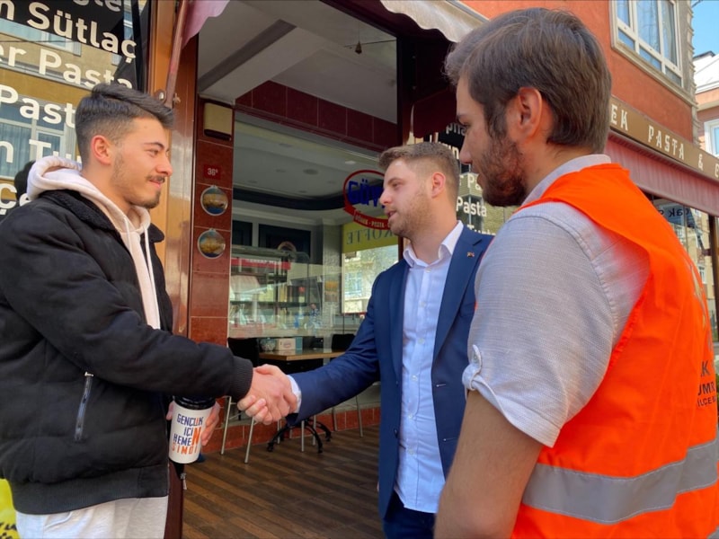 Seçim süreci daralırken saha çalışmalarına hız katan AK Parti Gençlik Kolları üyeleri, kendileri gibi ilk kez oy kullanacak gençlere bardak dağıtarak sohbet etti.