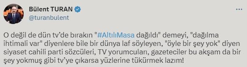 Turan, sosyal medya hesabından yaptığı açıklamada, söz konusu gelişme öncesinde altılı masanın dağılacağına yönelik söylemlere karşı çıkanları eleştirdi: