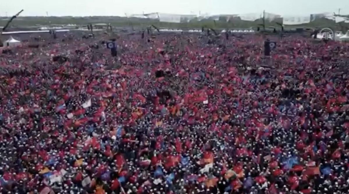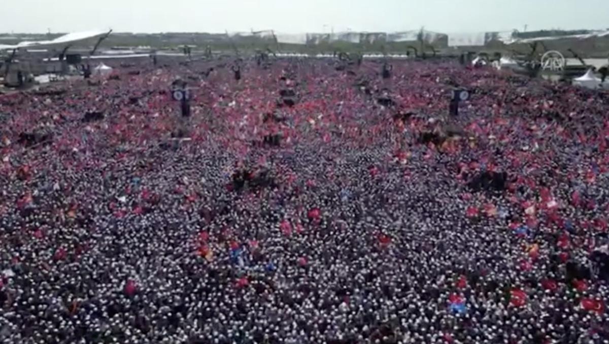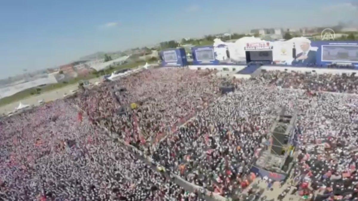 Ellerinde taşıdıkları Türk bayrakları ve AK Parti flamaları ile miting alanına ulaşan vatandaşların kalabalığı drone kamerasıyla görüntülendi.