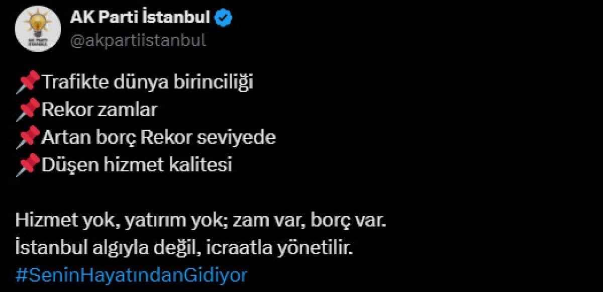 - AK Parti İstanbul İl Başkanlığı, şehrin sorunlarına dikkat çeken bir paylaşım yaptı.