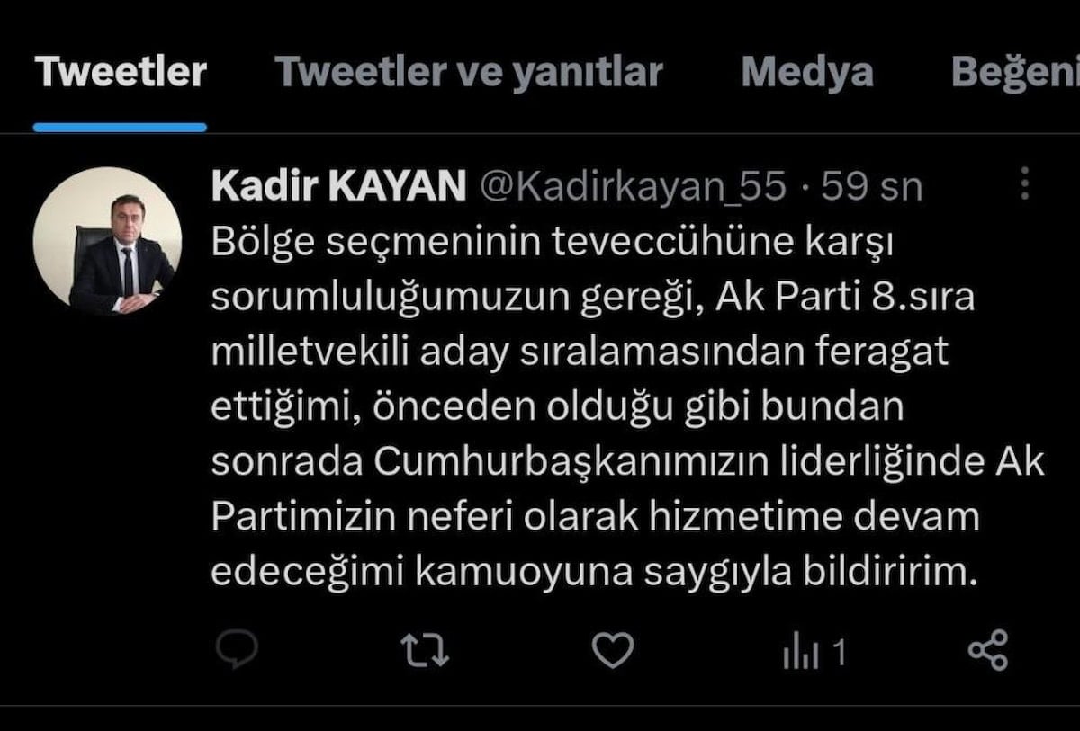 Bölge seçmeninin teveccühüne karşı sorumluluğumuzun gereği, AK Parti 8. sıra milletvekili aday sıralamasından feragat ettiğimi, önceden olduğu gibi bundan sonra da cumhurbaşkanımızın liderliğinde AK Partimizin neferi olarak hizmetime devam edeceğimi kamuoyuna saygıyla bildiririm.