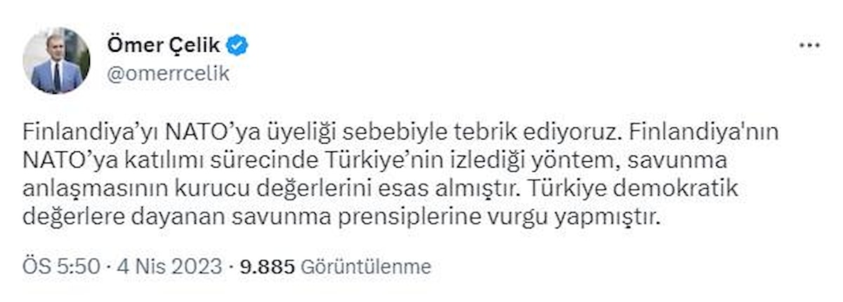 Gelişmenin ardından sosyal medya hesabından açıklamada bulunan AK Parti Sözcüsü Ömer Çelik, Finlandiya'yı tebrik etti.