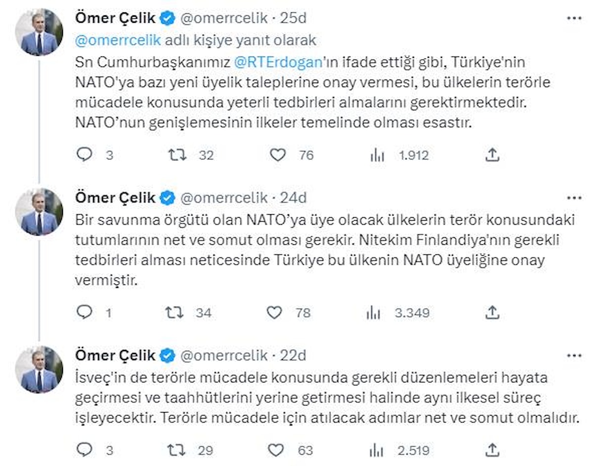 Sayın Cumhurbaşkanımız Recep Tayyip Erdoğan'ın ifade ettiği gibi, Türkiye'nin NATO'ya bazı yeni üyelik taleplerine onay vermesi, bu ülkelerin terörle mücadele konusunda yeterli tedbirleri almalarını gerektirmektedir. NATO’nun genişlemesinin ilkeler temelinde olması esastır.