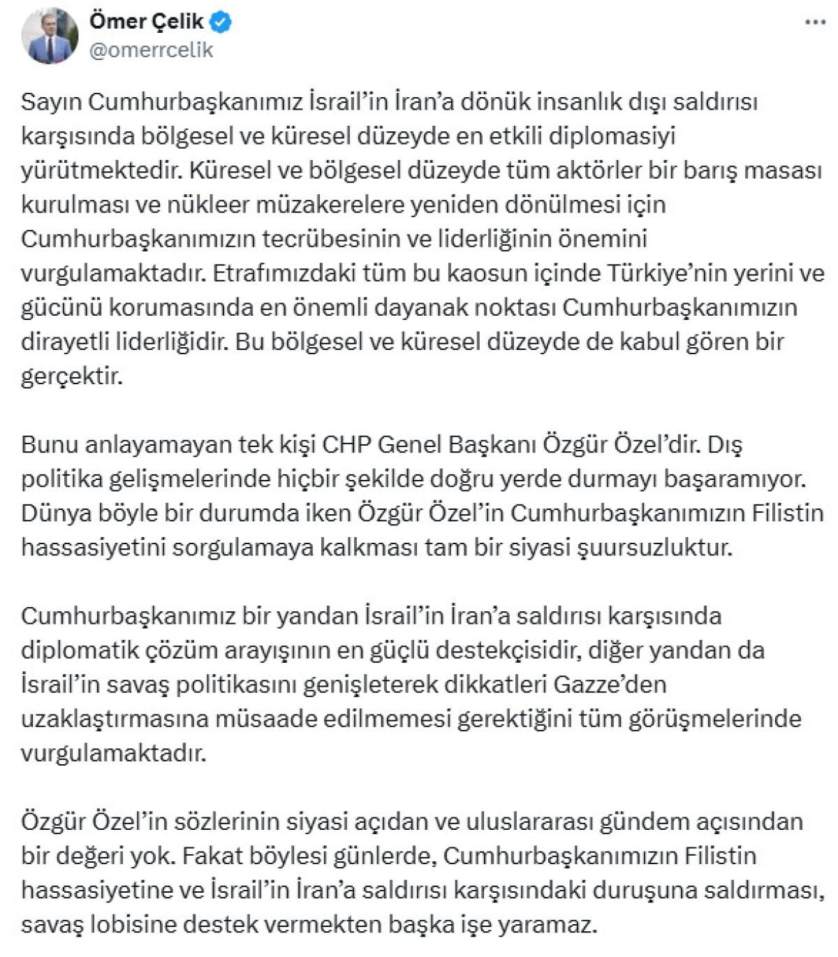 Özgür Özel’in sözlerinin siyasi açıdan ve uluslararası gündem açısından bir değeri yok. Fakat böylesi günlerde, Cumhurbaşkanımızın Filistin hassasiyetine ve İsrail’in İran’a saldırısı karşısındaki duruşuna saldırması, savaş lobisine destek vermekten başka işe yaramaz.