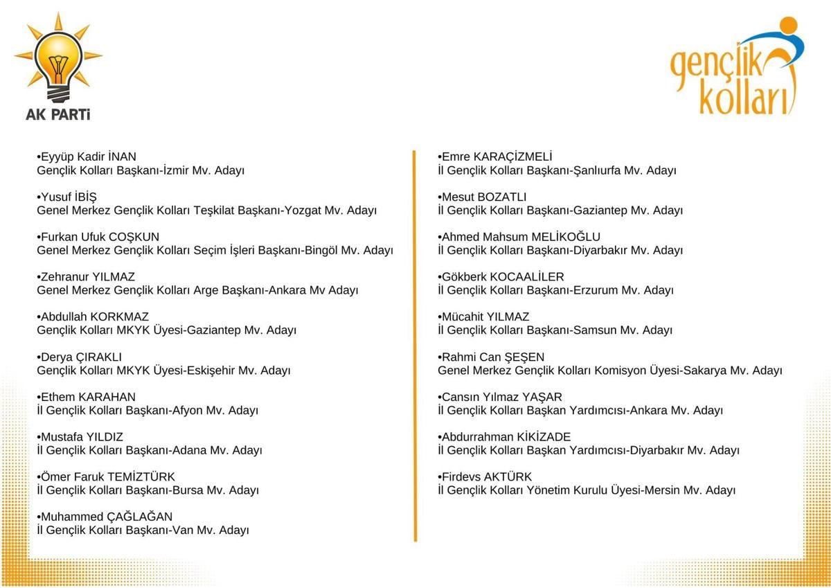 AK Parti Genel Merkez Gençlik Kolları Başkanı Eyyüp Kadir İnan başta olmak üzere, birçok genç ismi seçilebilecek yerden aday olarak gösteren AK Parti, gençlere verdiği önemi bir kez daha kanıtladı.