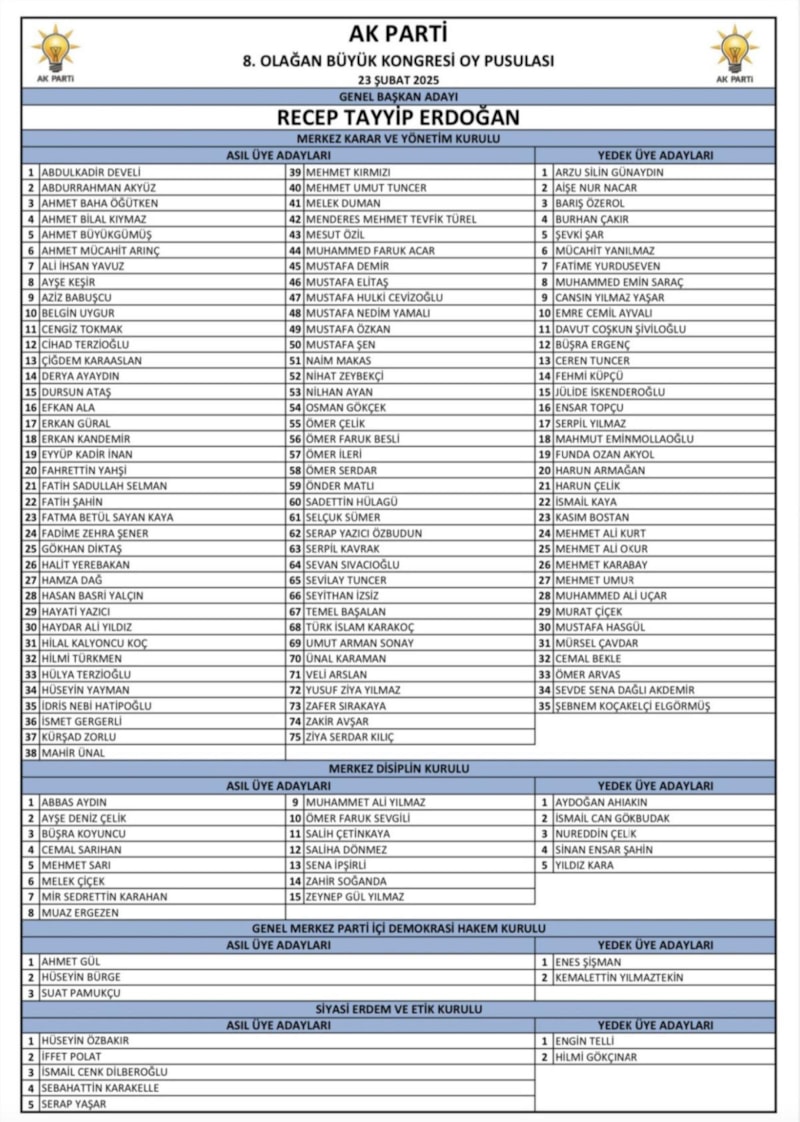Cumhurbaşkanı Erdoğan mevcut A takımını büyük oranda yine merkez karar ve yönetim kurulu listesine almış bulunuyor.