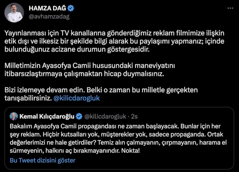Kılıçdaroğlu yaptığı paylaşımda, "Bakalım Ayasofya Camii propagandası ne zaman başlayacak. Bunlar için her şey reklam. Hiçbir kutsalları yok, müşterekler yok, sadece propaganda. Ortak değerlerimizi ne hale getirdiler? Temiz alın çalmayanın, çırpmayanın, harama el sürmeyenin, halkını aç bırakmayanındır. Nokta!" ifadelerini kullanmıştı.