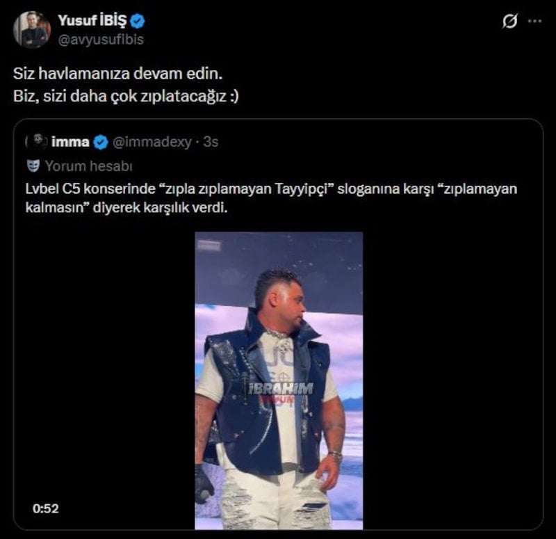 AK Parti Gençlik Kolları Başkanı Yusuf İbiş'ten, konser esnasında "Zıplamayan Tayyipçi" sloganlarına ve sloganlara destek veren Lvbel C5'e yanıt geldi; "Biz, sizi daha çok zıplatacağız".