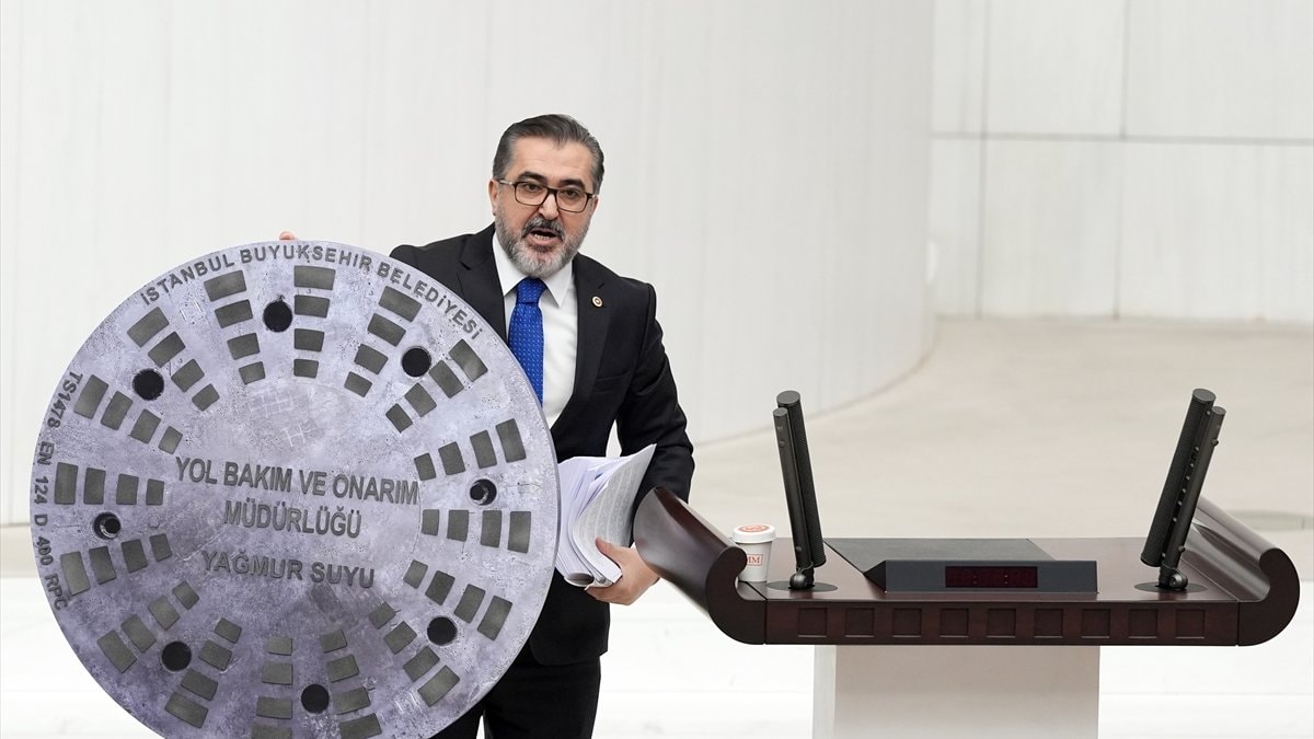 Görüşmeler sırasında AK Parti İstanbul Milletvekili Adem Yıldırım, konuşmak üzere kürsüye rögar kapağı ile çıktı.