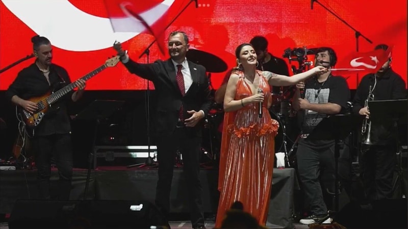 Melek Mosso'yu kiraz festivali kapsamında konsere çağıran Süleymanpaşa Belediye Başkanı Cüneyt Yüksel, tepkilere inat sahneye çıktı ve Melek Mosso'ya sarılıp elini öptü.