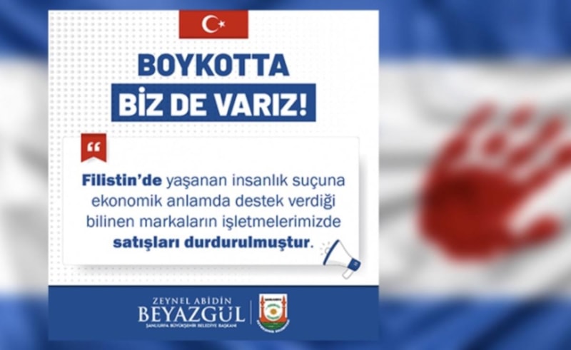 Şanlıurfa Büyükşehir Belediyesi'nin sosyal medya platformu X'ten yaptığı paylaşımda, İsrail'e yönelik boykot kararı alındığı belirtildi.