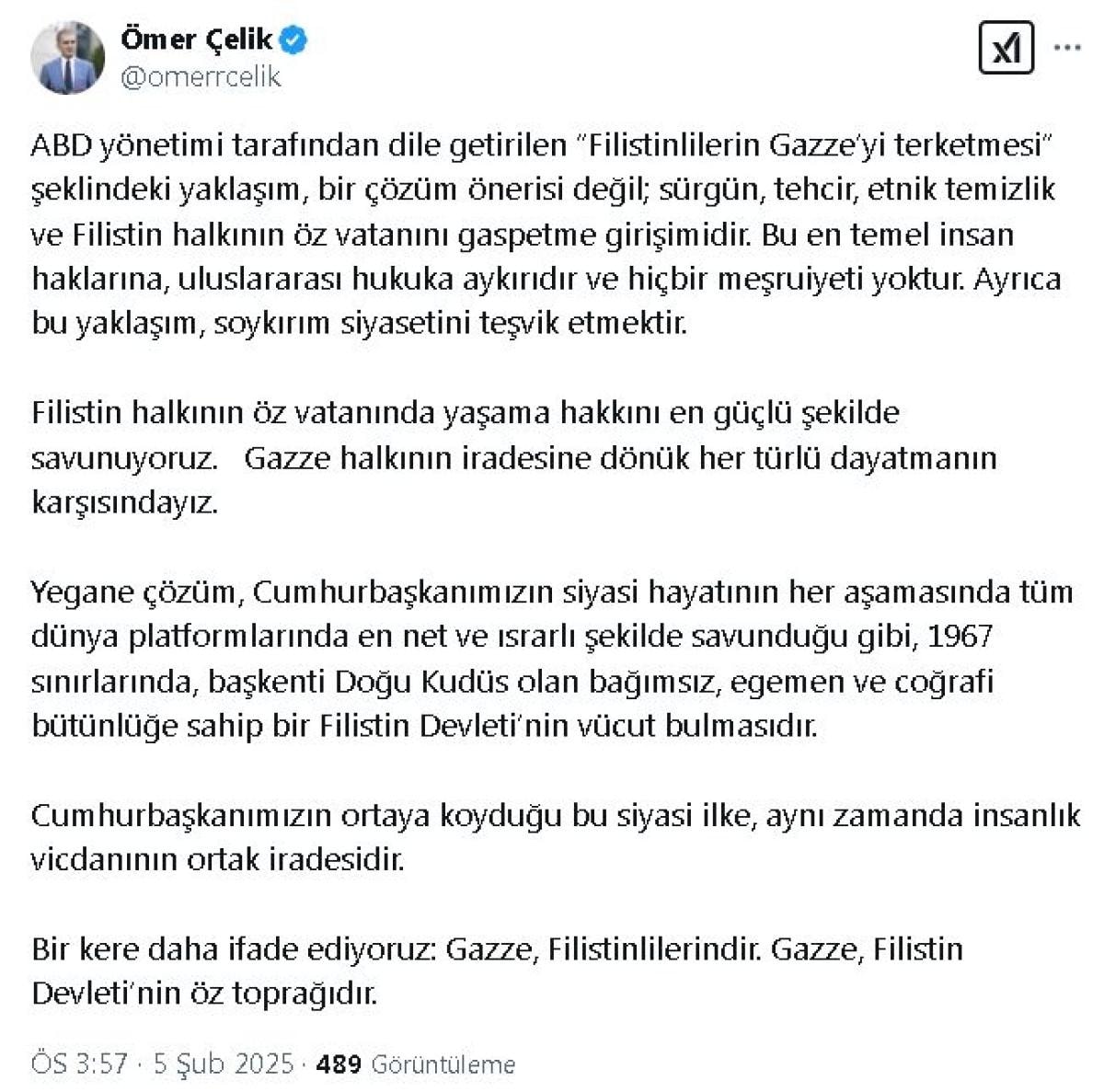 AK Partili Ömer Çelik, sosyal medya hesabından yaptığı açıklamada, "ABD yönetimi tarafından dile getirilen 'Filistinlilerin Gazze'yi terk etmesi' şeklindeki yaklaşım, bir çözüm önerisi değil; sürgün, tehcir, etnik temizlik ve Filistin halkının öz vatanını gasbetme girişimidir.