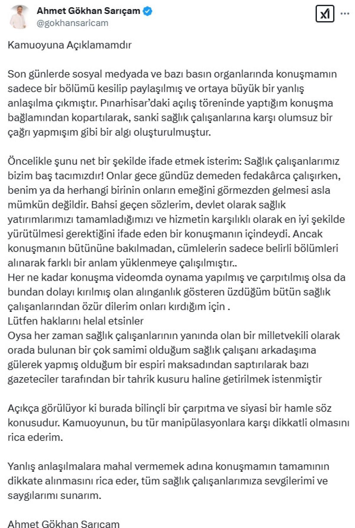 Oysa her zaman sağlık çalışanlarının yanında olan bir milletvekili olarak orada bulunan bir çok samimi olduğum sağlık çalışanı arkadaşıma gülerek yapmış olduğum bir espiri maksadından saptırılarak bazı gazeteciler tarafından bir tahrik kusuru haline getirilmek istenmiştir