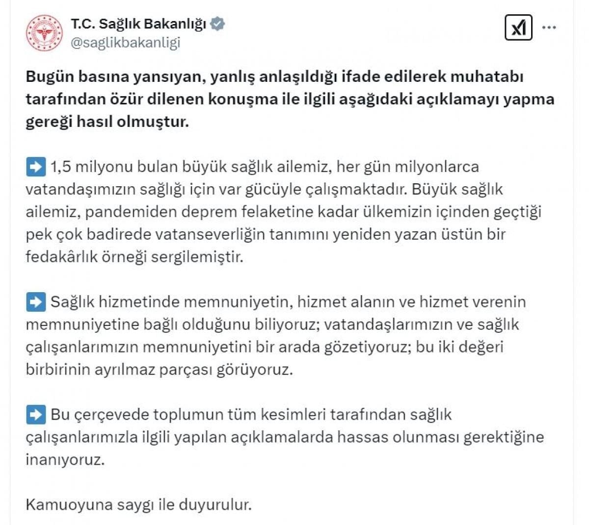 Bugün basına yansıyan, yanlış anlaşıldığı ifade edilerek muhatabı tarafından özür dilenen konuşma ile ilgili aşağıdaki açıklamayı yapma gereği hasıl olmuştur. 1,5 milyonu bulan büyük sağlık ailemiz, her gün milyonlarca vatandaşımızın sağlığı için var gücüyle çalışmaktadır.