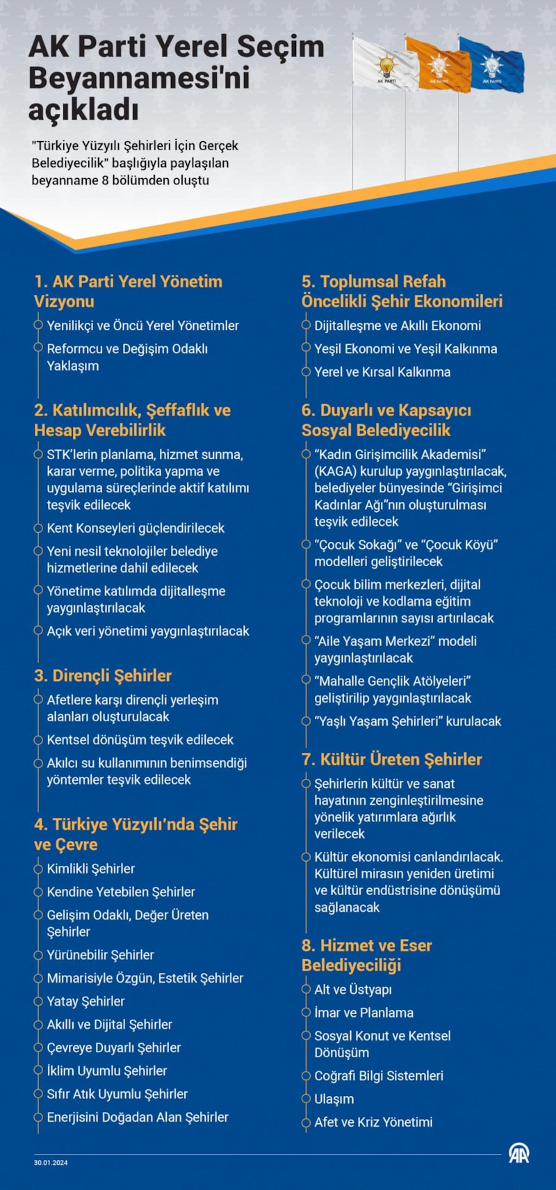 AK Parti’nin beyannamesi, “Türkiye Yüzyılı İçin Gerçek Belediyecilik” temasıyla hazırlandı. 8 başlıktan oluşan beyanname, 200 sayfadan oluşuyor.