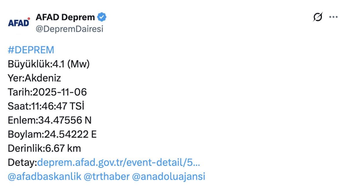 - Akdeniz açıklarında 4.1 büyüklüğünde deprem meydana geldi.