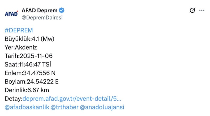 Afet ve Acil Durum Yönetimi Başkanlığı'ndan edinilen bilgiye göre, Akdeniz açıklarında saat 11.46'da, 4.1 büyüklüğünde deprem meydana geldi.