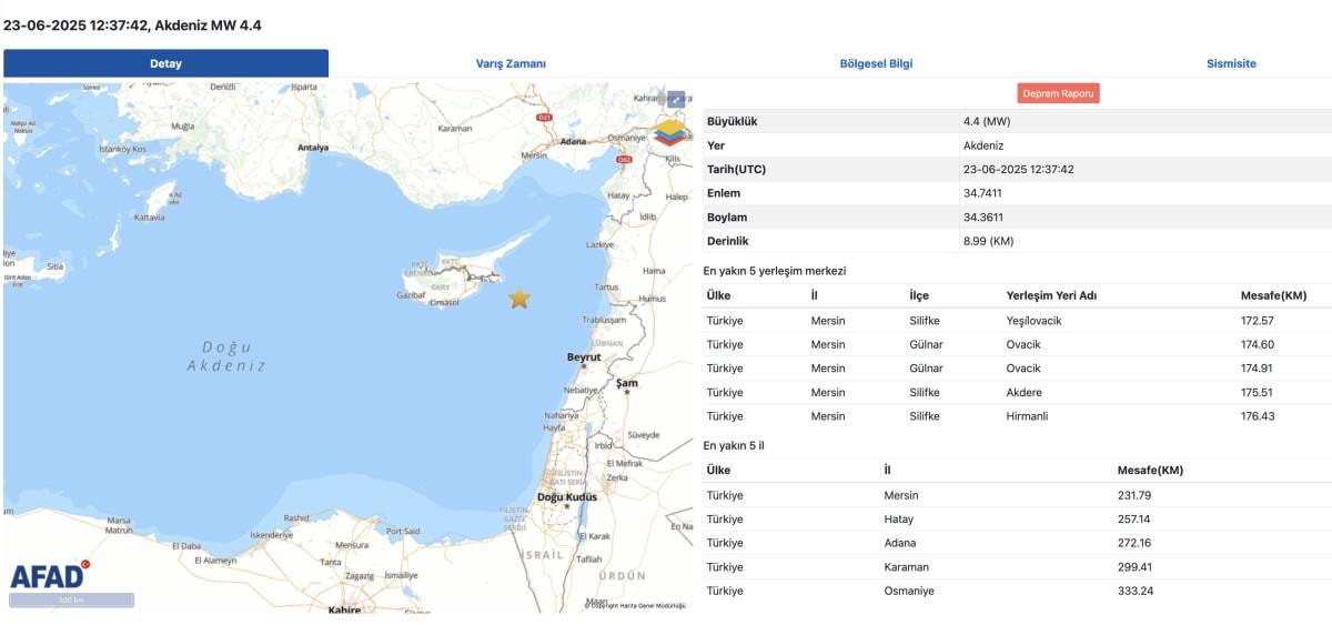 İçişleri Bakanlığı Afet ve Acil durum Yönetimi Başkanlığı'nın (AFAD) bildirdiğine göre, Akdeniz'de gerçekleşen deprem Mersin ve ilçelerinden hissedildi.