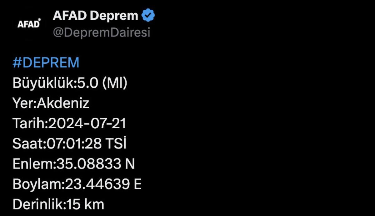 Afet ve Acil Durum Yönetimi Başkanlığı'nın açıklamasına göre Akdeniz'de saat 07.01'de 5 büyüklüğünde bir sarsıntı yaşandı.