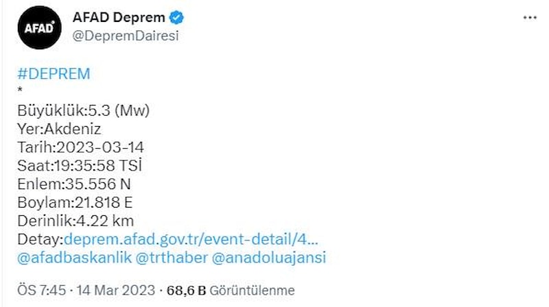 AFAD, saat 19.35'te merkez üssü Akdeniz olan 5.3 büyüklüğünde bir deprem meydana geldiği duyurdu.