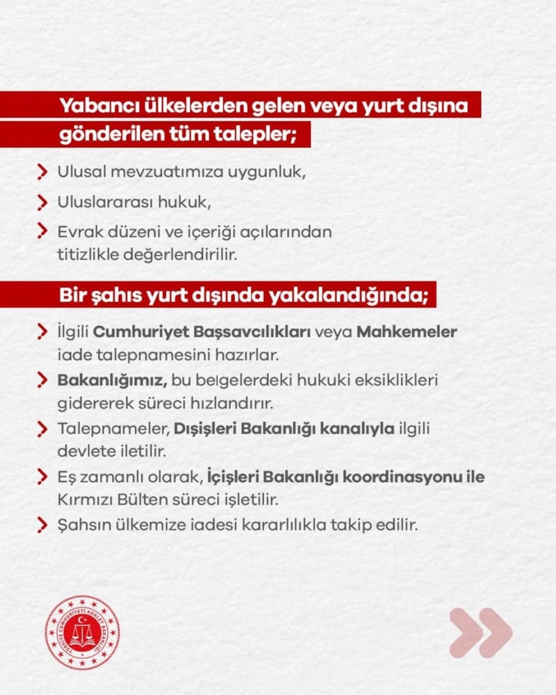 Adalet Bakanlığımızın yürüttüğü ve İçişleri Bakanlığımız ile Dışişleri Bakanlığımızın koordinasyonunda sürdürülen bu süreç, Türkiye’nin kurumsal kapasitesini ve kararlılığını açık şekilde ortaya koymaktadır.