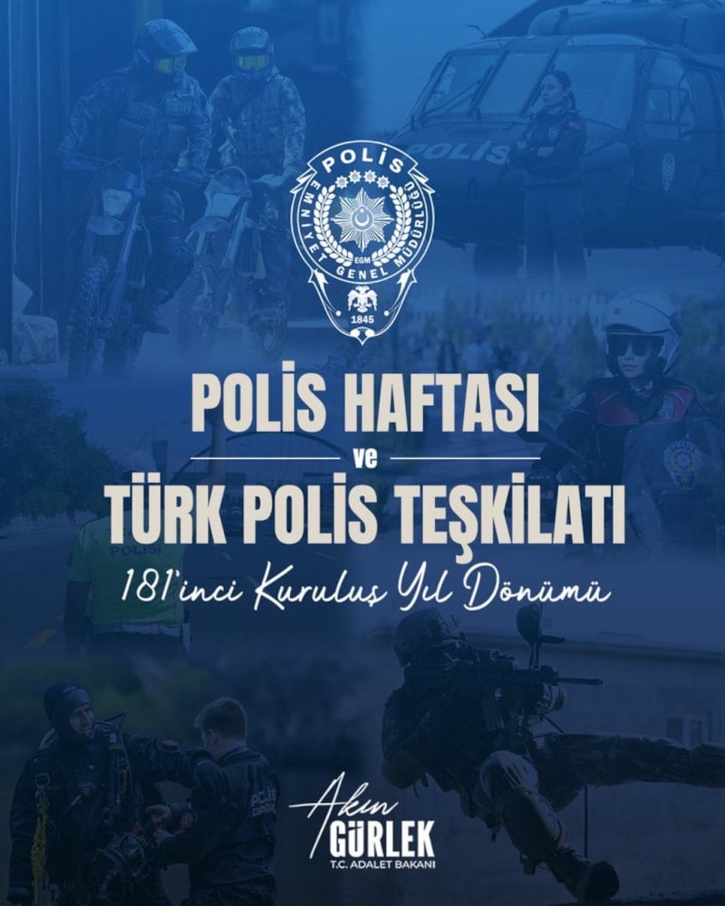 Adalet Bakanı Akın Gürlek, Türk Polis Teşkilatı'nın 181'inci yıl dönümü ve Polis Haftası'na ilişkin yayınladığı mesajda, "Rabbim sizleri her türlü tehlikeden muhafaza eylesin" ifadelerine yer verdi.