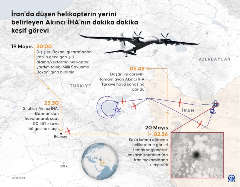 İran Cumhurbaşkanı Reisi'nin helikopterinin yerini belirleyen Akıncı İHA, Cumhurbaşkanlığı'ndan onay alınmasının ardından saat 23.30'da Batman'dan havalandı. Saat 02.36'da kaza kırıma uğrayan helikopterle görsel temas sağlandı ve Akıncı İHA saat 06.45'te Türkiye'ye döndü.