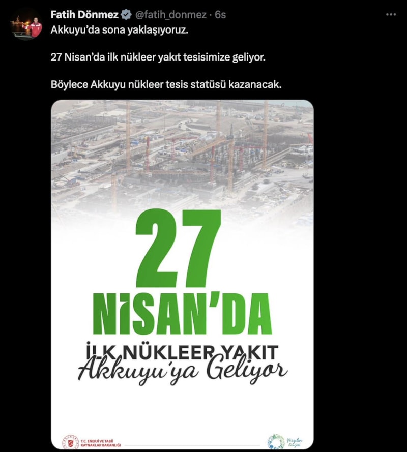 Bakan Fatih Dönmez sosyal medya hesabından yaptığı paylaşımda, "Akkuyu'da sona yaklaşıyoruz. 27 Nisan'da ilk nükleer yakıt tesisimize geliyor. Böylece Akkuyu, nükleer tesis statüsü kazanacak" ifadelerine yer verdi.