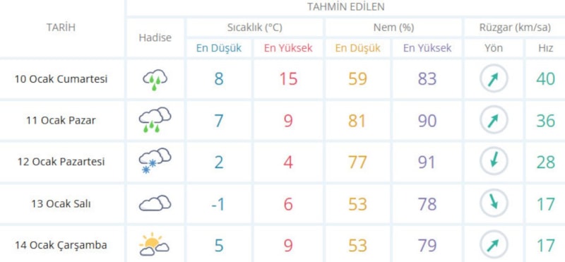 Çarşamba sabah saatlerine kadar sıcaklıkların -1 ila 4 dereceler aralığında seyredeceği, pazar akşamından itibaren karla karışık yağmur ve yüksek bölgelerde kar, pazartesi günü ilk saatlerden itibaren ise yer yer kuvvetli kar yağışının etkili olması öngörülüyor.