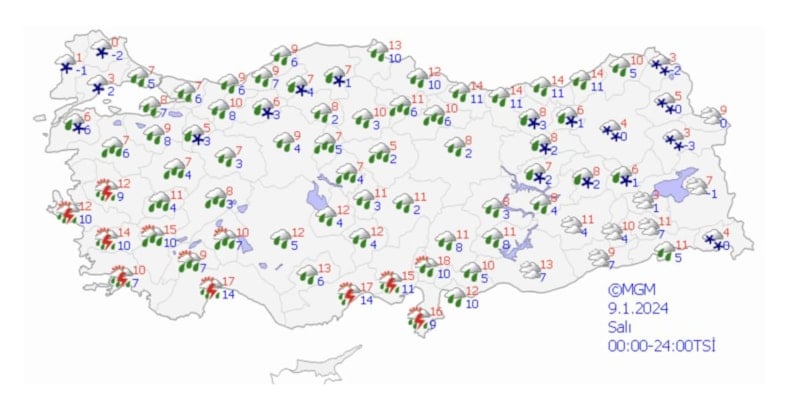 9 Ocak Salı günü hava durumu