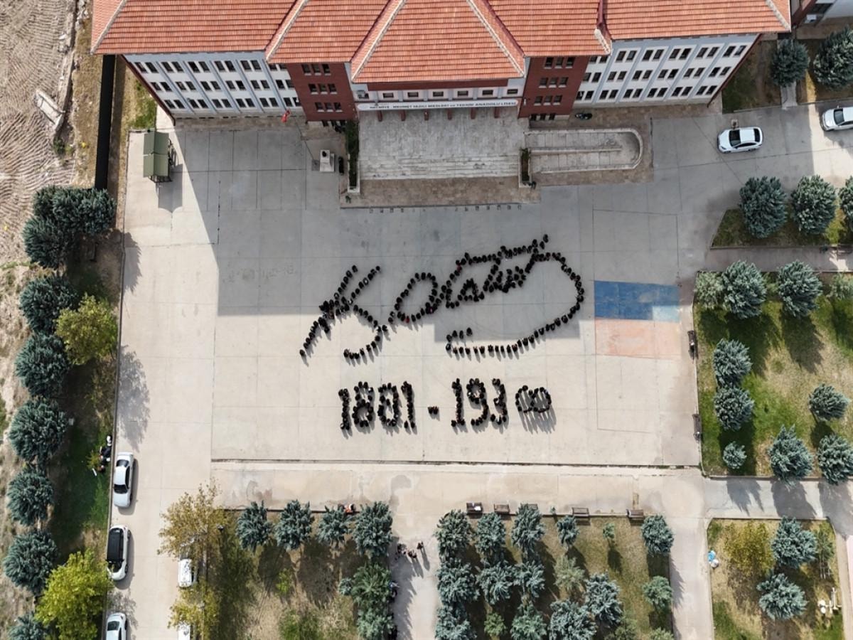 450 öğrencinin bedenleriyle oluşturduğu görsel şölende, Atatürk’ün imzası ile doğum ve ölüm tarihi yer aldı. O anlar, havadan çekilen görüntülerle kayda alındı ve sosyal medya üzerinden paylaşıldı.