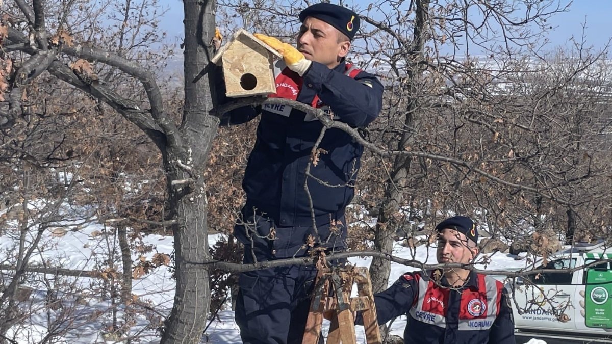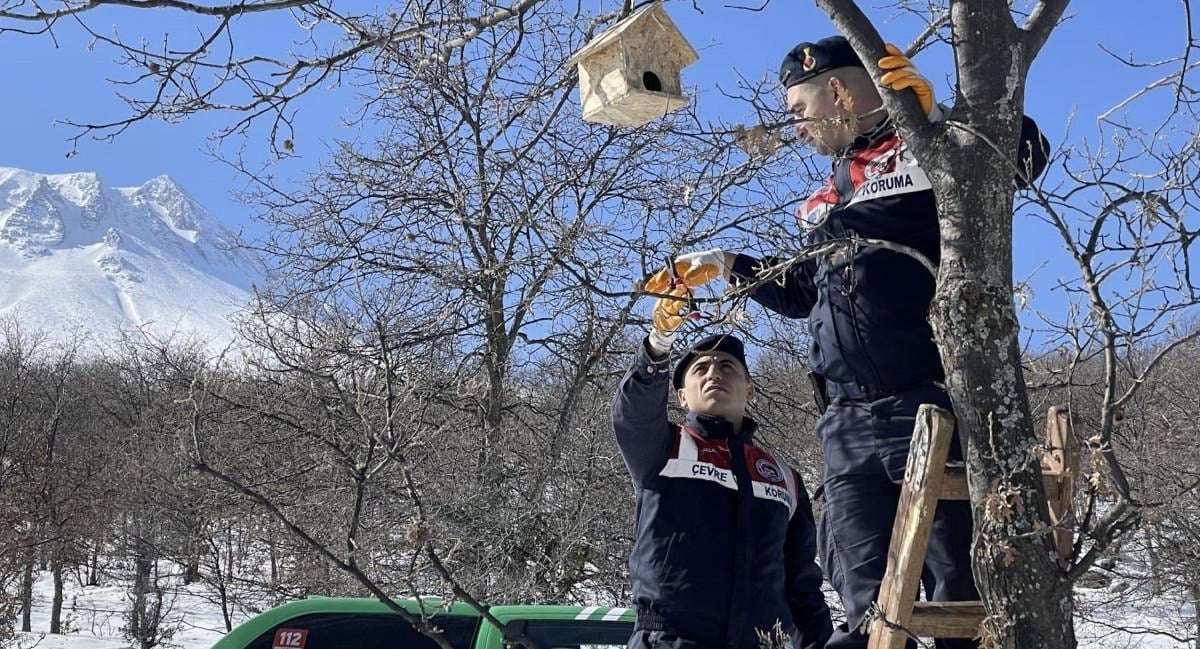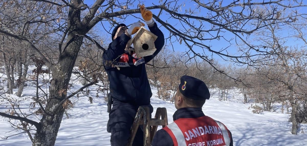 Yaban kuşlarının yaşam şartlarını kolaylaştırmak, beslenmelerini sağlamak amacıyla yüzlerce kuş yuvası yapan jandarma ekipleri, ağaçlara yuvaları asarak yuva önü ve içlerine mama bıraktı.