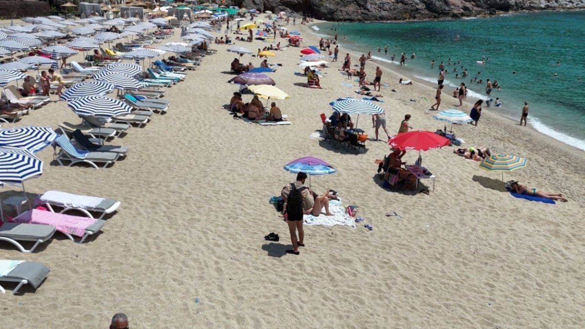 Antalya'nın Alanya ilçesinde hava sıcaklığının 30 dereceyi bulduğu haziran ayında bayram öncesi yerli ve yabancı turistler dünyaca ünlü Kleopatra Plajı'na akın etti.