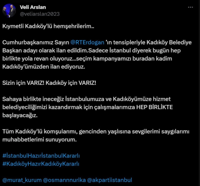 Arslan paylaşımında, "Kıymetli Kadıköy'lü hemşehrilerim.. Cumhurbaşkanımız Sayın Recep Tayyip Erdoğan'ın tensipleriyle Kadıköy Belediye Başkan adayı olarak ilan edildim.Sadece İstanbul diyerek bugün hep birlikte yola revan oluyoruz…