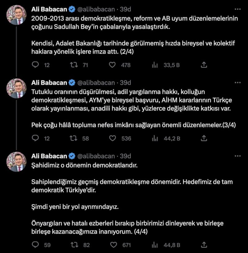 Babacan, "Şimdi yeni bir yol ayrımındayız. Önyargıları ve hatalı ezberleri bırakıp birbirimizi dinleyerek ve birleşe birleşe kazanacağımıza inanıyorum." ifadelerini kullandı.