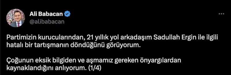 Sadullah Ergin’in CHP’den aday gösterilmesinin ardından Millet İttifakı’nda kriz çıktı. Günlerdir konuyla ilgili sessizliğini koruyan Ali Babacan yaptığı açıklamada, “Önyargıları ve hatalı ezberleri bırakıp, birbirimizi dinleyerek ve birleşe birleşe kazanacağımıza inanıyorum” dedi.