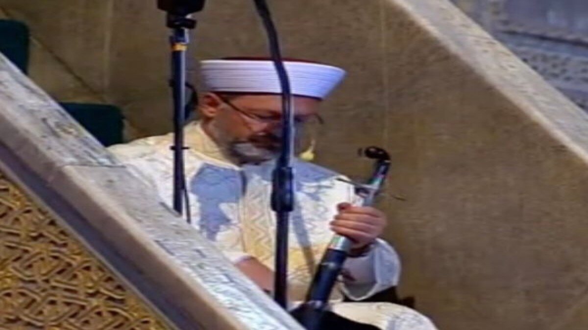 Namaz öncesinde hutbeyi okumak için minbere çıkan Diyanet İşleri Başkanı Ali Erbaş'ın elinde fethin sembolü olan bir kılıç vardı.
