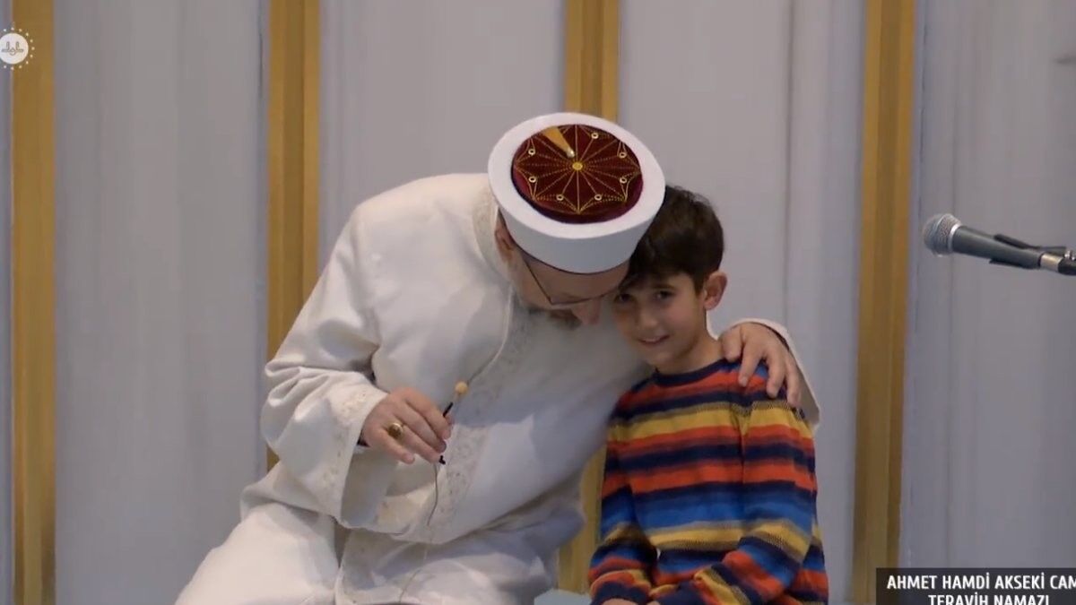 Teravih için Ankara'daki Ahmet Hamdi Akseki Camisi'nde olan Ali Erbaş, namaz sonrası yanına çağırdığı Mustafa Hamza isimli bir çocuğa dua okuttu.