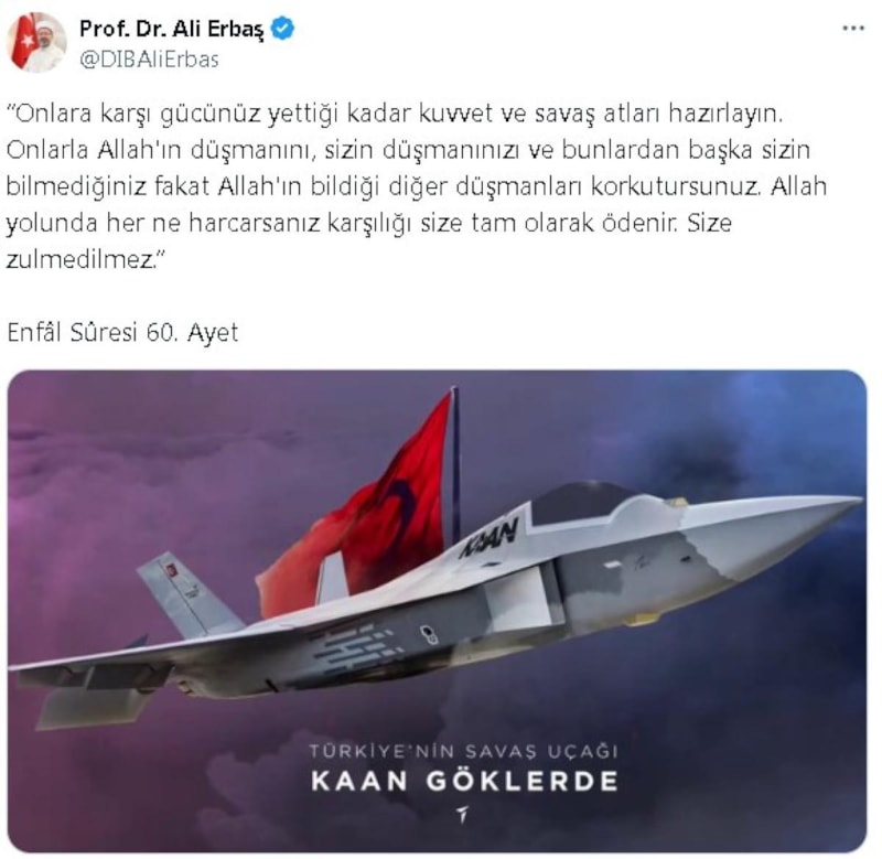 Ali Erbaş'ın dün sosyal medya hesabından KAAN fotosuyla yaptığı paylaşım şöyle: