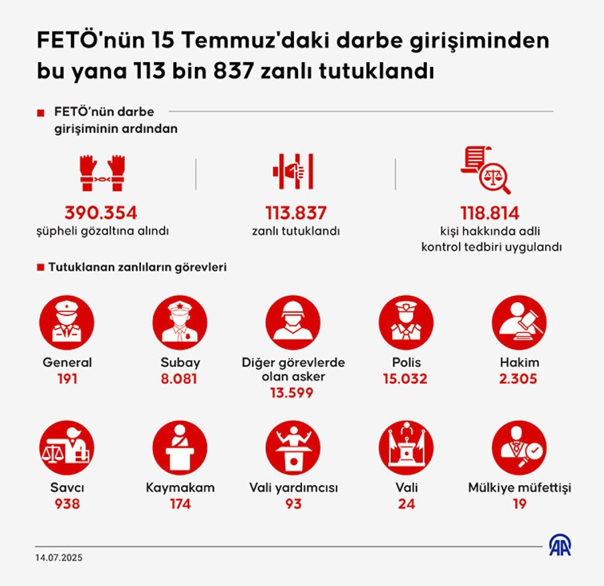 Bakan Yerlikaya, kendileri için bu mücadelenin, geçmişin hesabını sormak kadar, geleceklerini de korumak olduğunu vurgulayarak, "Bugüne kadar 390 bin 322 şahıs gözaltına alınmış, 113 bin 844 şahıs tutuklanmış, 118 bin 822 şahıs hakkında adli kontrol uygulanmış, 153 bin 382 şahıs ise serbest bırakılmıştır. FETÖ elebaşının ölümünden sonra da bu hain yapının peşini bırakmadık. Bu kabine döneminde de FETÖ'ye yönelik, 10 bin 968 operasyon düzenledik. Bu operasyonlar sonucu 17 bin 890 şahıs gözaltına alındı. Bu şahısların 3 bin 245'i tutuklandı, 3 bin 861'i hakkında adli kontrol kararı verildi." bilgilerini paylaştı.