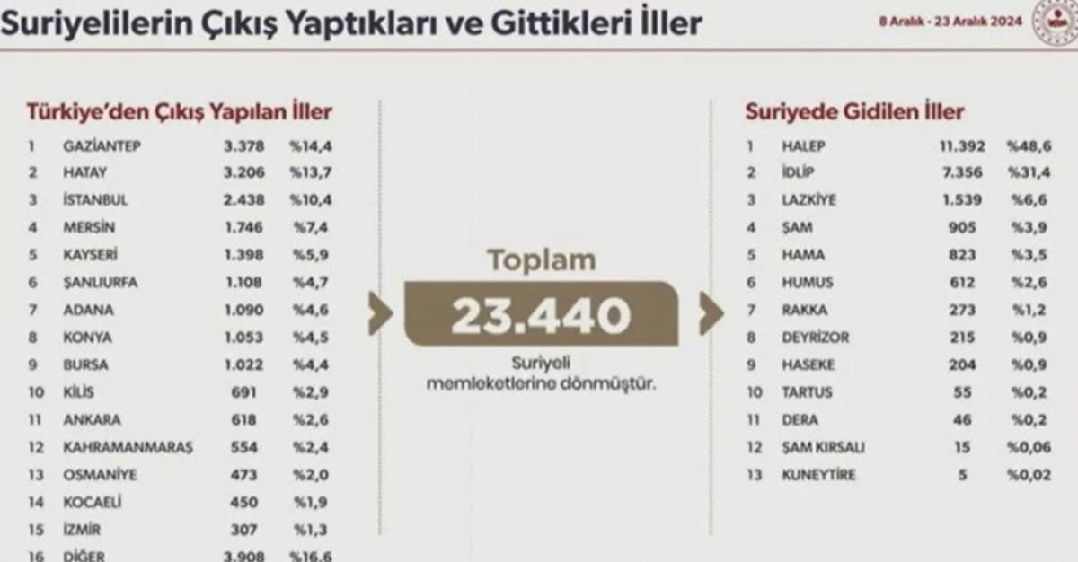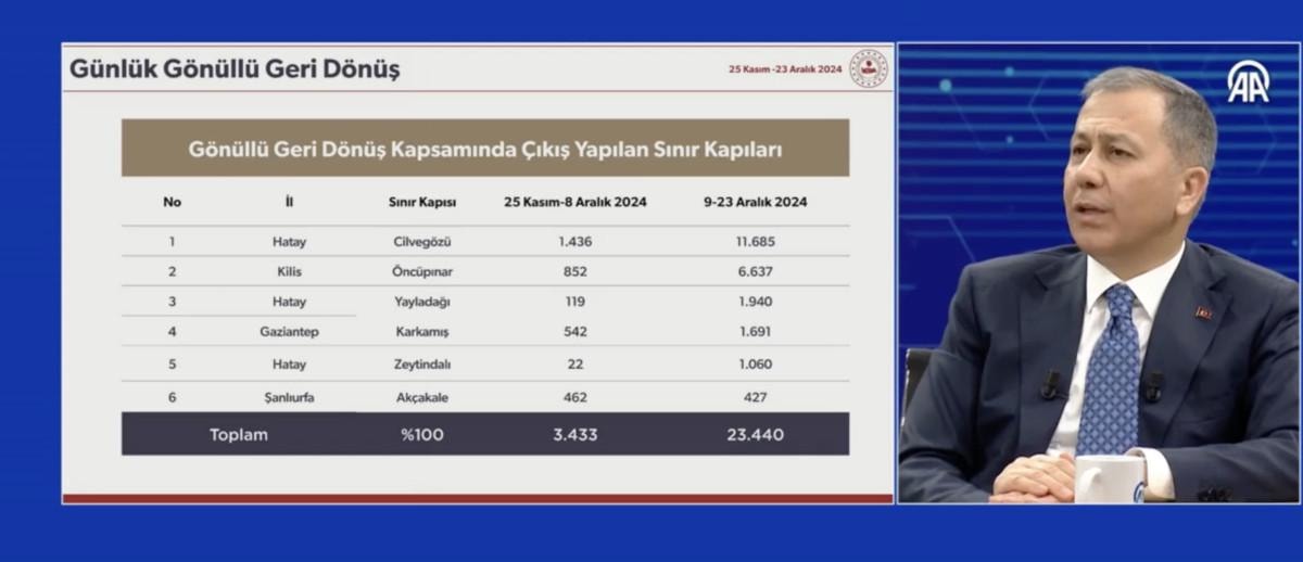 İki hafta içerisinde 25 bini aşkın Suriyelinin ülkesine döndüğünü söyleyen Bakan Yerlikaya, geri dönüşlerde en fazla kullanılan sınır kapılarını ve en fazla hangi ilden Suriyeli vatandaşın gittiğini de açıkladı.