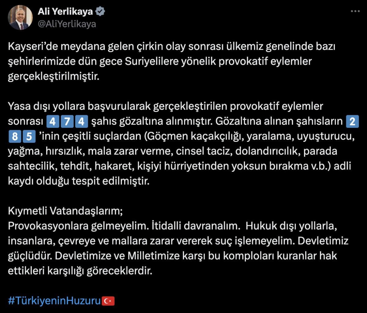 Yaşanan olayların ardından güvenlik güçleri harekete geçti. İçişleri Bakanı Ali Yerlikaya, konuyla ilgili yeni bir açıklama yaptı.