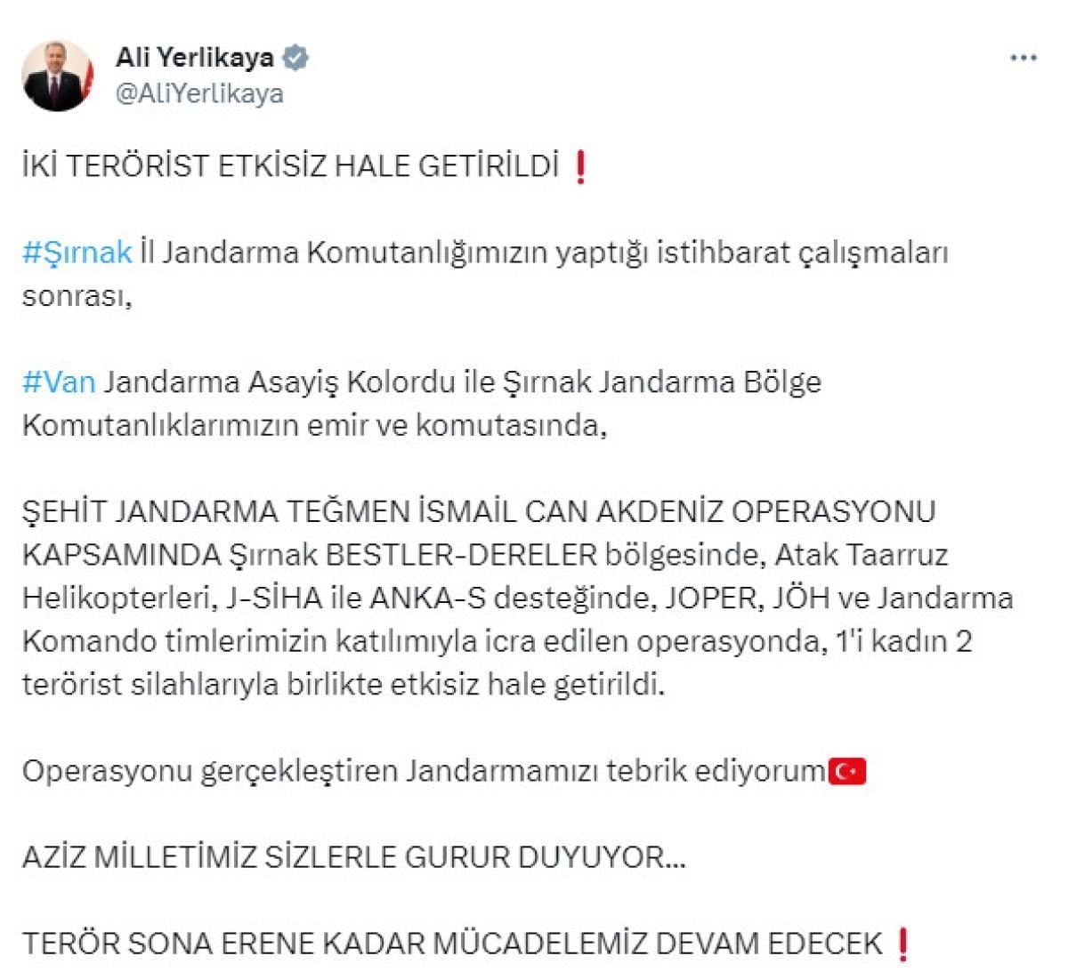 Operasyonu gerçekleştiren Jandarmamızı tebrik ediyorum. Aziz milletimiz sizinle gurur duyuyor. Terör sona erene kadar mücadelemiz devam edecek.