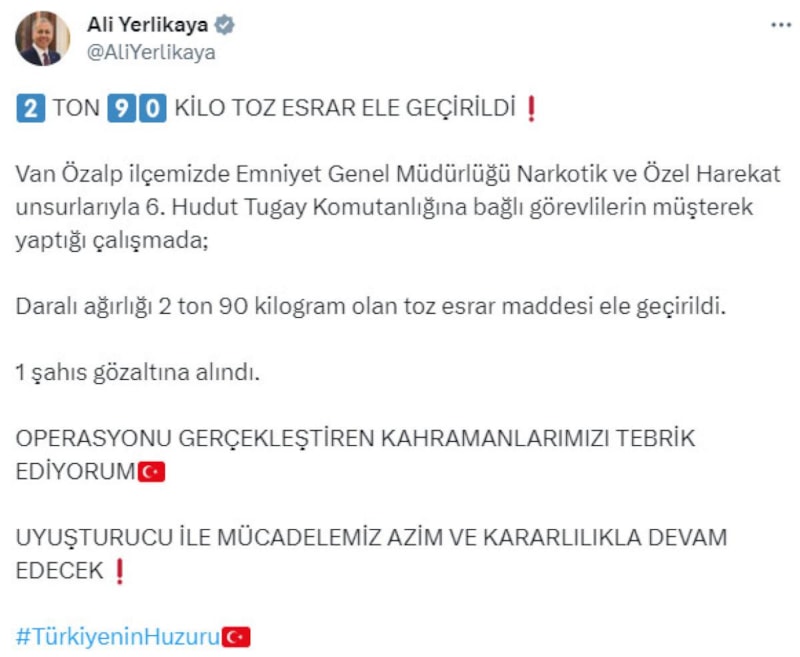 Van Emniyet Müdürlüğü tarafından yapılan uyuşturucu operasyonuna ilişkin paylaşımda bulunan İçişleri Bakanı Ali Yerlikaya, "2 ton 90 kilogram olan toz esrar maddesi ele geçirildi. 1 şahıs gözaltına alındı" dedi.
