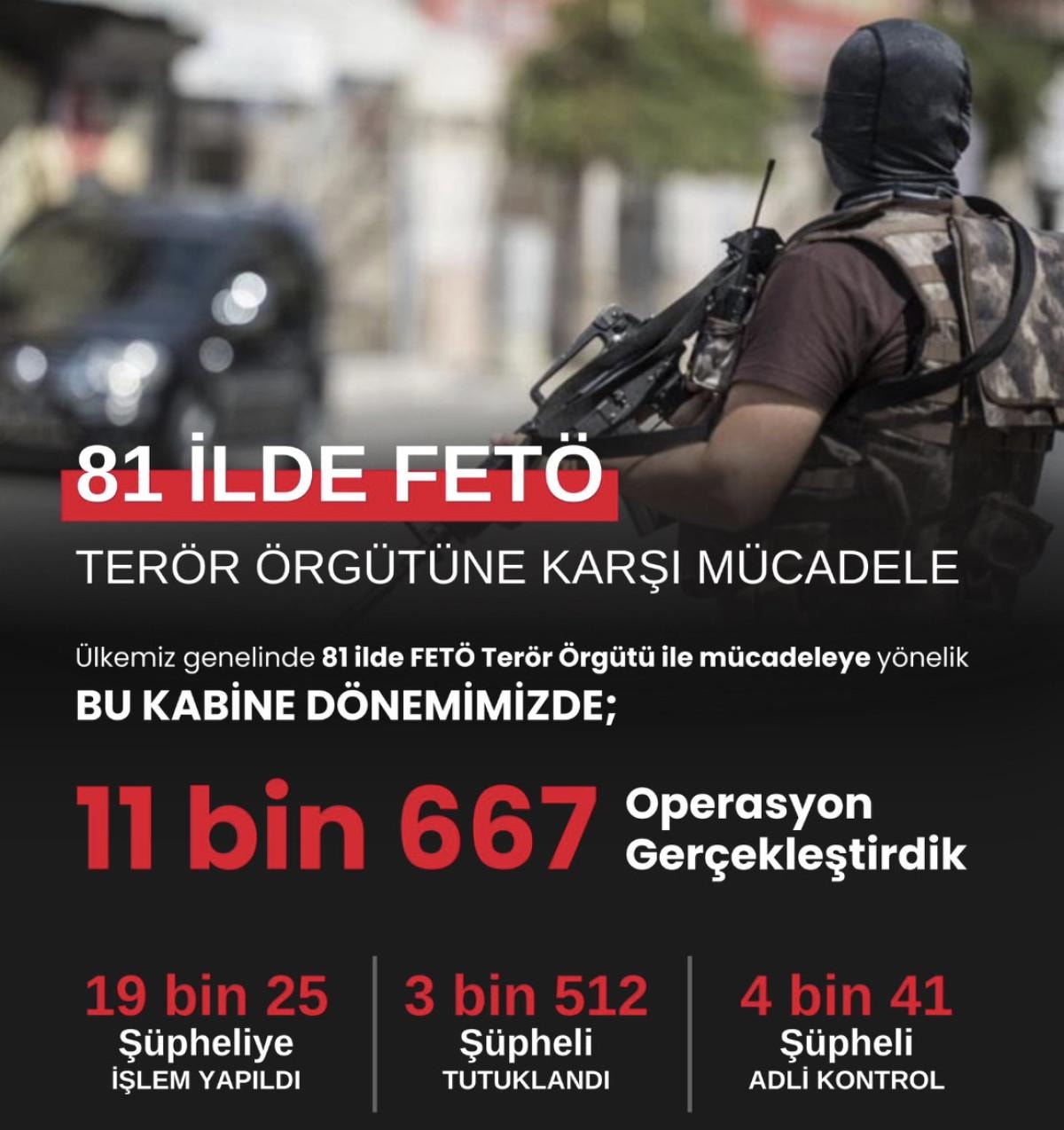 Bu kabine dönemimizde FETÖ’ye yönelik 11 bin 667 operasyon gerçekleştirdik. Bu operasyonlarımızda toplam;